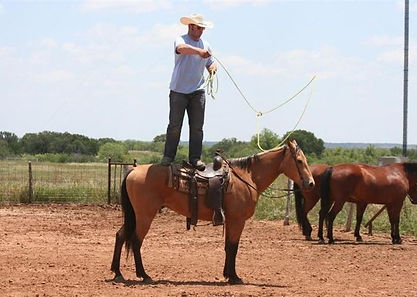 She has a "been there, done that" attitude about everything! She is level headed, soft in the bridle, works off of your legs, collects herself and rides just as good bareback with a halter as she does with a saddle and bridle. You can climb all over her, stand up on her, slide off her butt, crawl underneath her, etc. She has been around dogs, donkeys, goats, guns, 4-wheelers, pigs, bulls, and traffic. The possibilities are endless with this one!